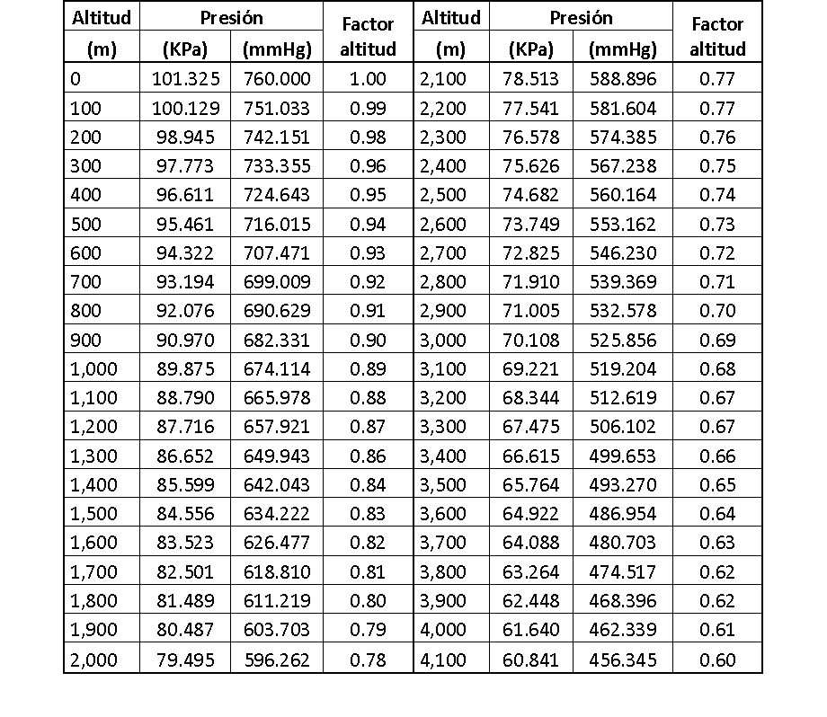 P= Presión atmosférica expresada en Kilo Pascales (KPa)